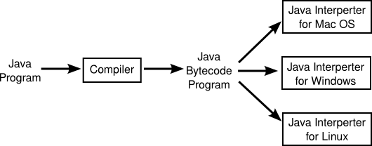 Of course, a different Java bytecode interpreter is needed for each type of computer, but once a computer has a Java bytecode interpreter, it can run any Java bytecode program, and the same program can be run on any computer that has such an interpreter. This is one of the essential features of Java: the same compiled program can be run on many different types of computers.