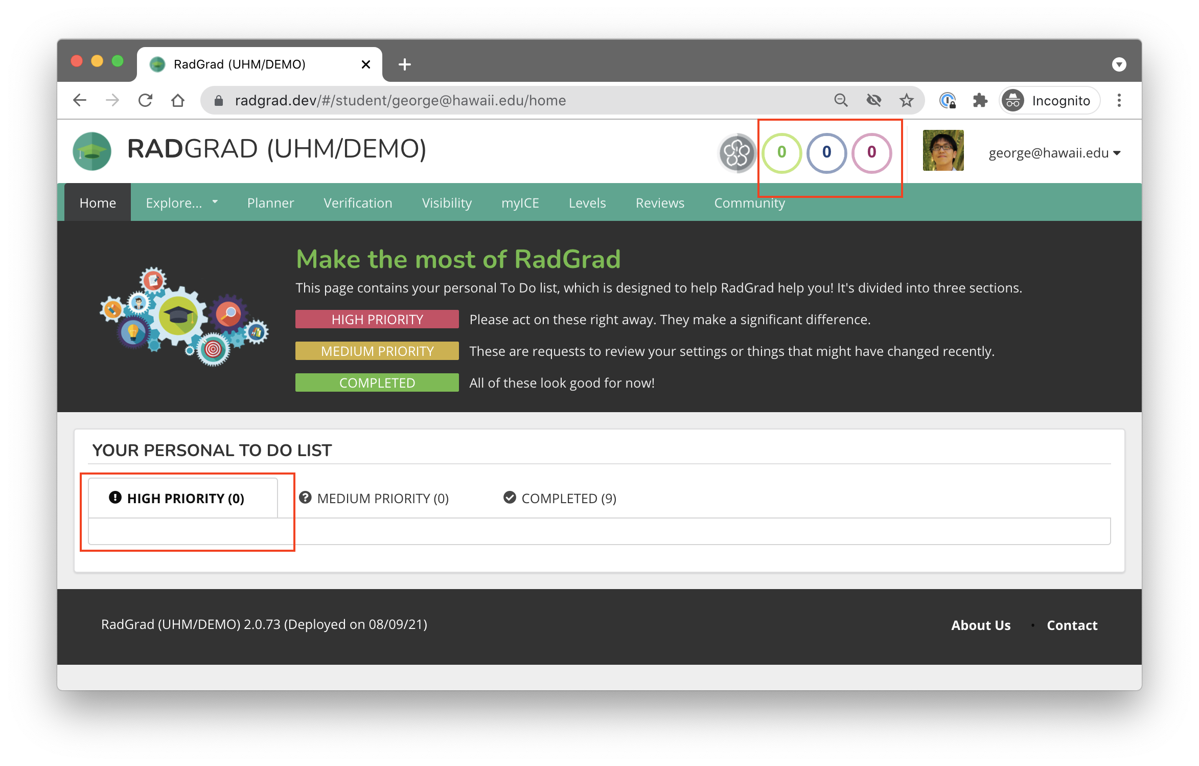 As indicated by the two red rectangles in the above screen shot, two parts of your RadGrad Home Page should illustrate that you’ve completed the tutorial successfully: