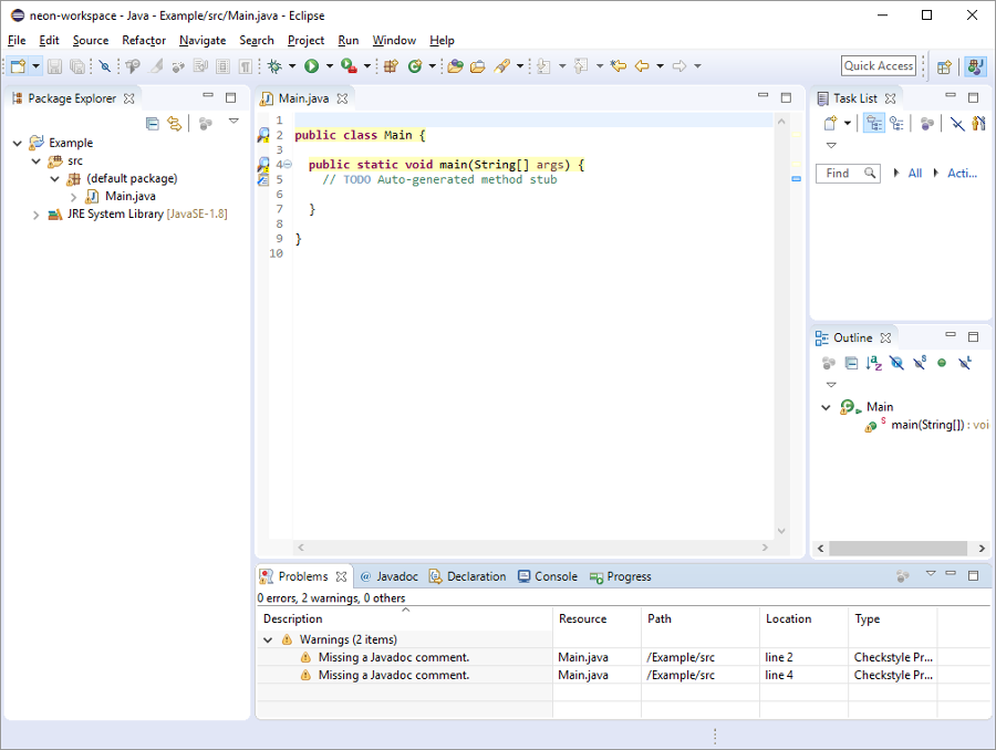To fix the problems add JavaDoc comments for the Main class and the main method using Source -> Generate Element Comment.