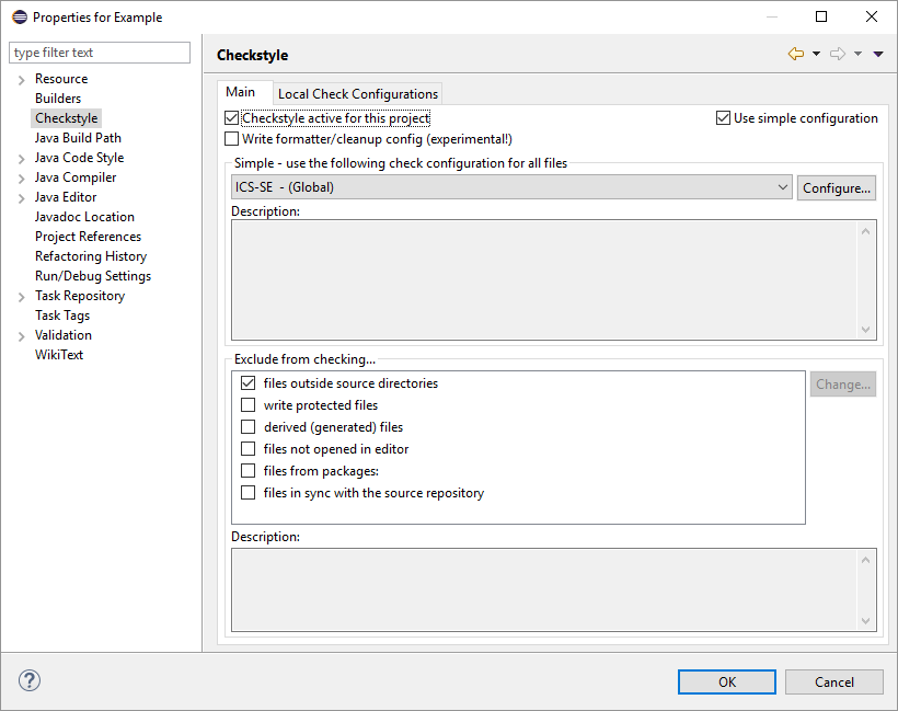 In Eclipse, select “Window / Preferences / Checkstyle”, then click “New..” to bring up the “Check Configuration Properties” window. Select “External Configuration File” as the Type, provide “ICS-SE” as the Name, and browse to the file to fill the Location field.