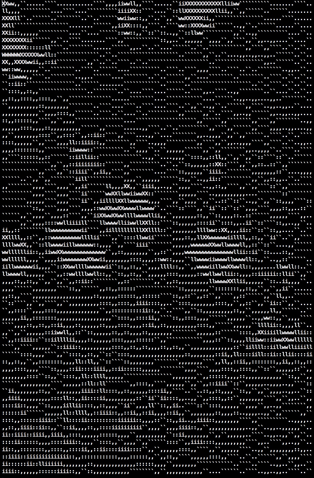 As we explained above, each pixel is described by three integers, the RGB values. The luminance of the pixel is defined as the sum of these three integers and can be used to convert a color image to a grayscale image. To convert from grayscale to ASCII art, we simple assign ASCII characters to grayscale ranges. The luminance of a pixel is a number between 0 and 255*3=765. To create our ASCII art we use use 9 ASCII characters: period, backtick, comma, colon, lower case i, lower case l, lowercase w, uppercase x, uppercase w. If the luminance of a pixel if between 0 and 84 then we print ‘.’ in the terminal, if it is between 85 and 169 then we print ‘`’, … if it is between 680 and 765 (inclusive) then we print ‘W’. (Note that the last range is larger by 1 item, which you need to handle in your program.)