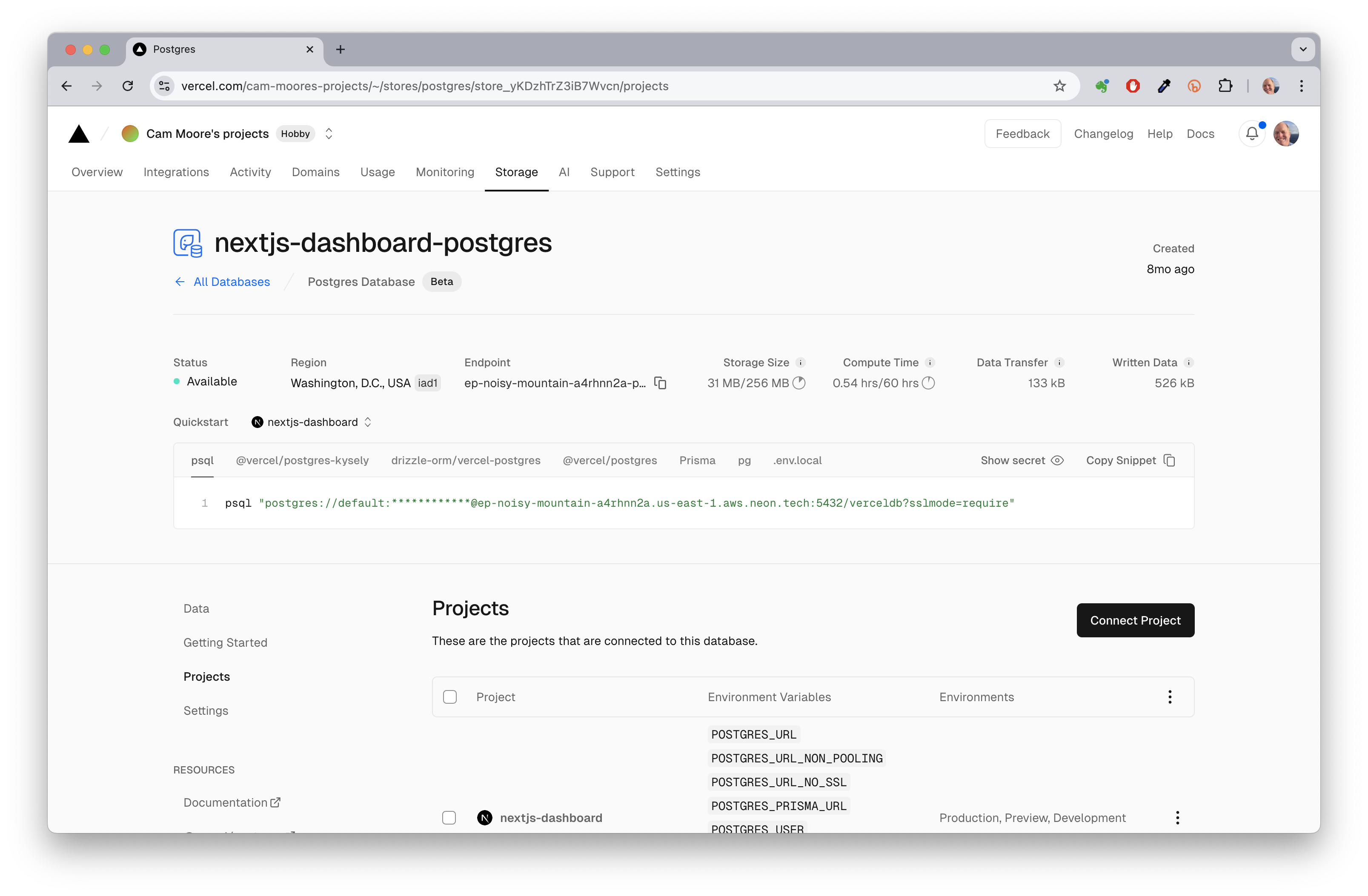 When you connected your my-nextjs-application project to the Vercel PostgreSQL database, Vercel created environment variables needed to connect to the database. You can see these environment variables in the Vercel dashboard.