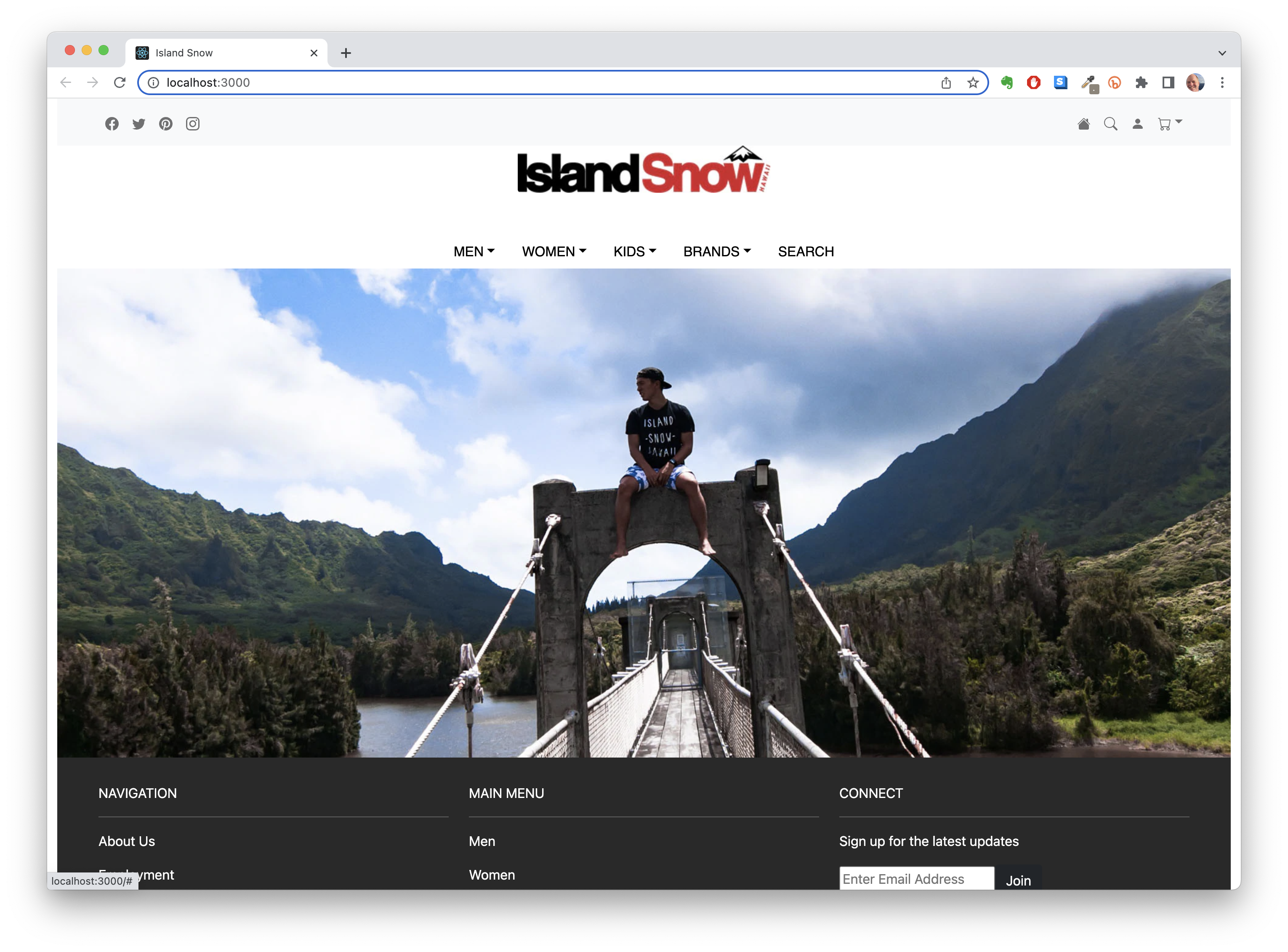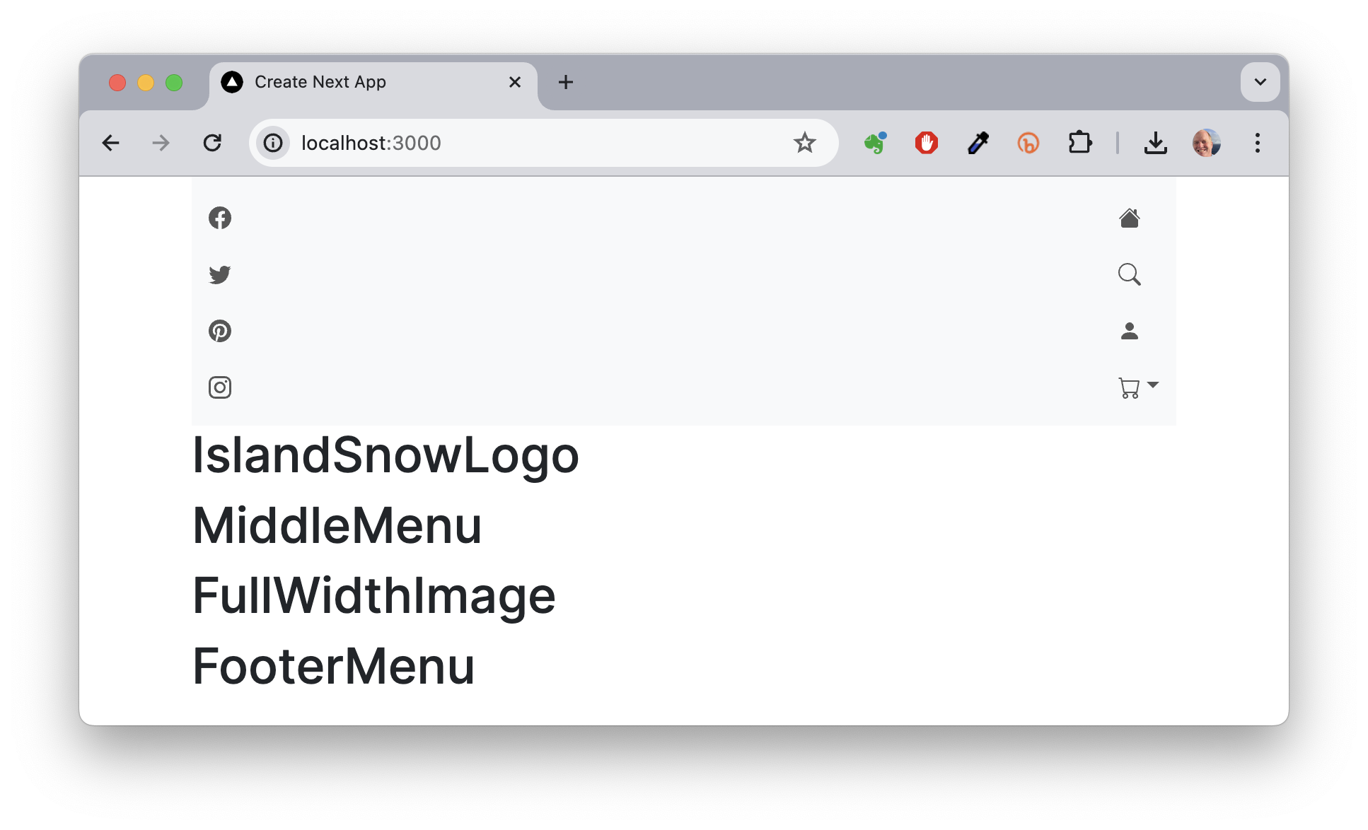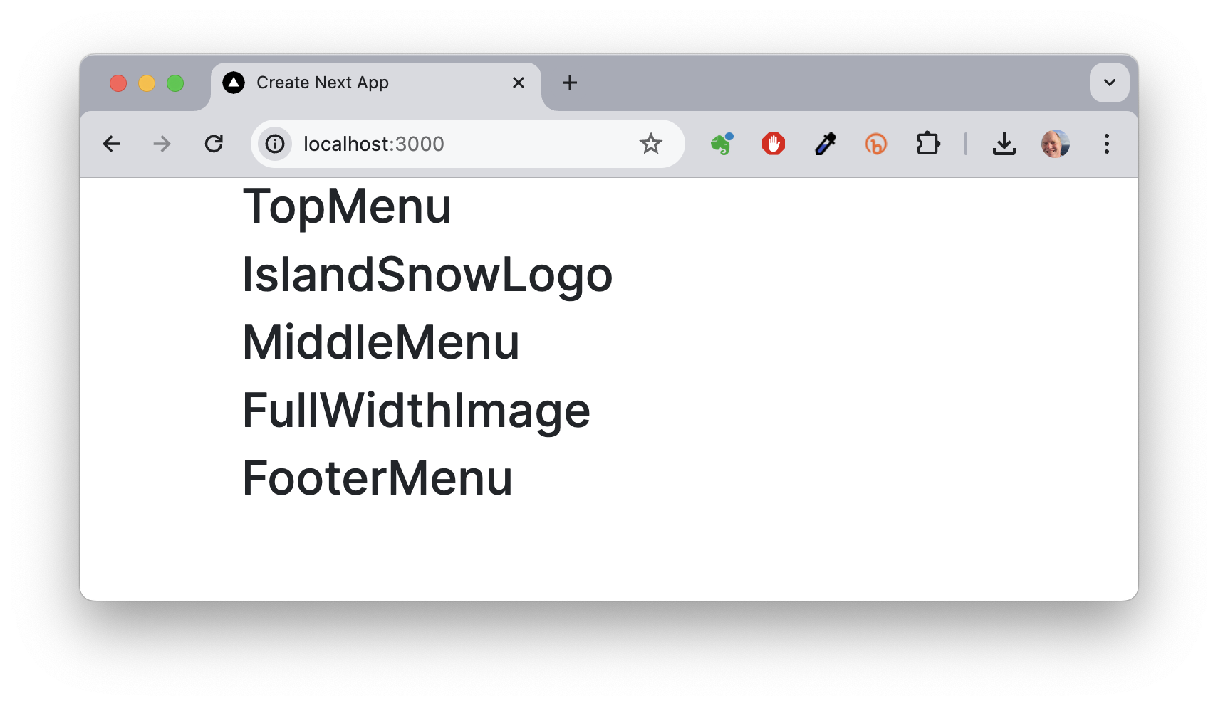 A good way to proceed is to create 5 React components, each one responsible for rendering one section of the site, plus a top-level IslandSnow component that calls each of them. For example, your page.js file could look like this: