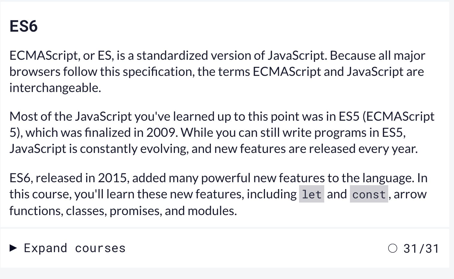 Now move on and complete the 31 exercises in the “ES6” curriculum. Here’s what the module summary should look like when you’ve completed all 31 exercises: