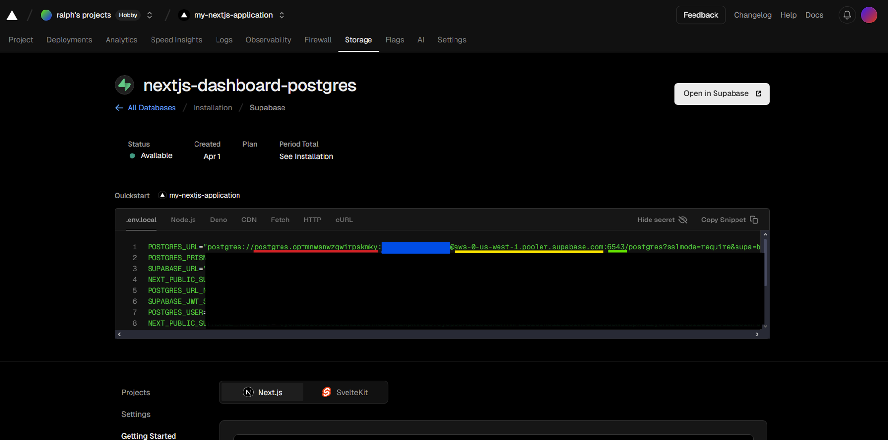 In order to find the hostname, port, username, and password, go to your Vercel Supabase dashboard in the tab Storage. Click on Show secret and you will only really need the first URL called POSTGRES_URL.