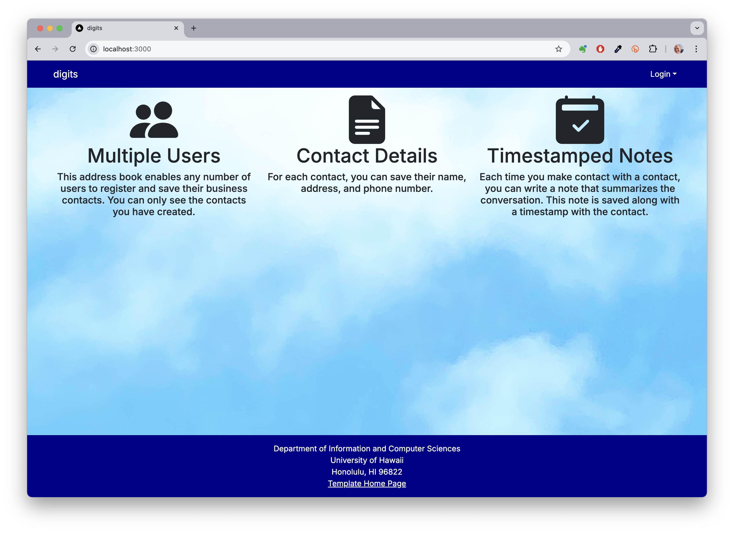 Edit src/app/layout.tsx and src/components/NavBar.tsx to say “digits” rather Next.js Application Template.