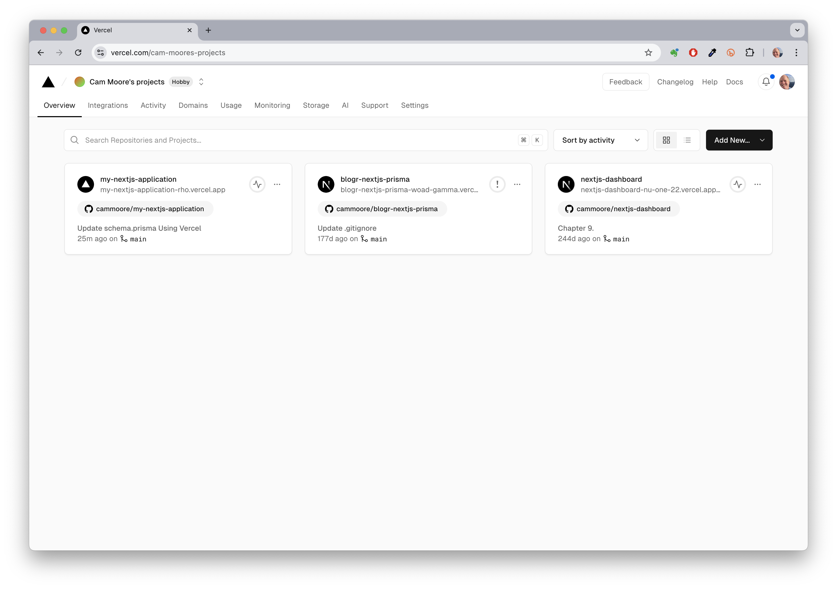 Your output will be different, depending on your GitHub account and the name of your project. The .vercel directory is created in your project directory, and it is added to the .gitignore file. Do not commit this directory to your repository.