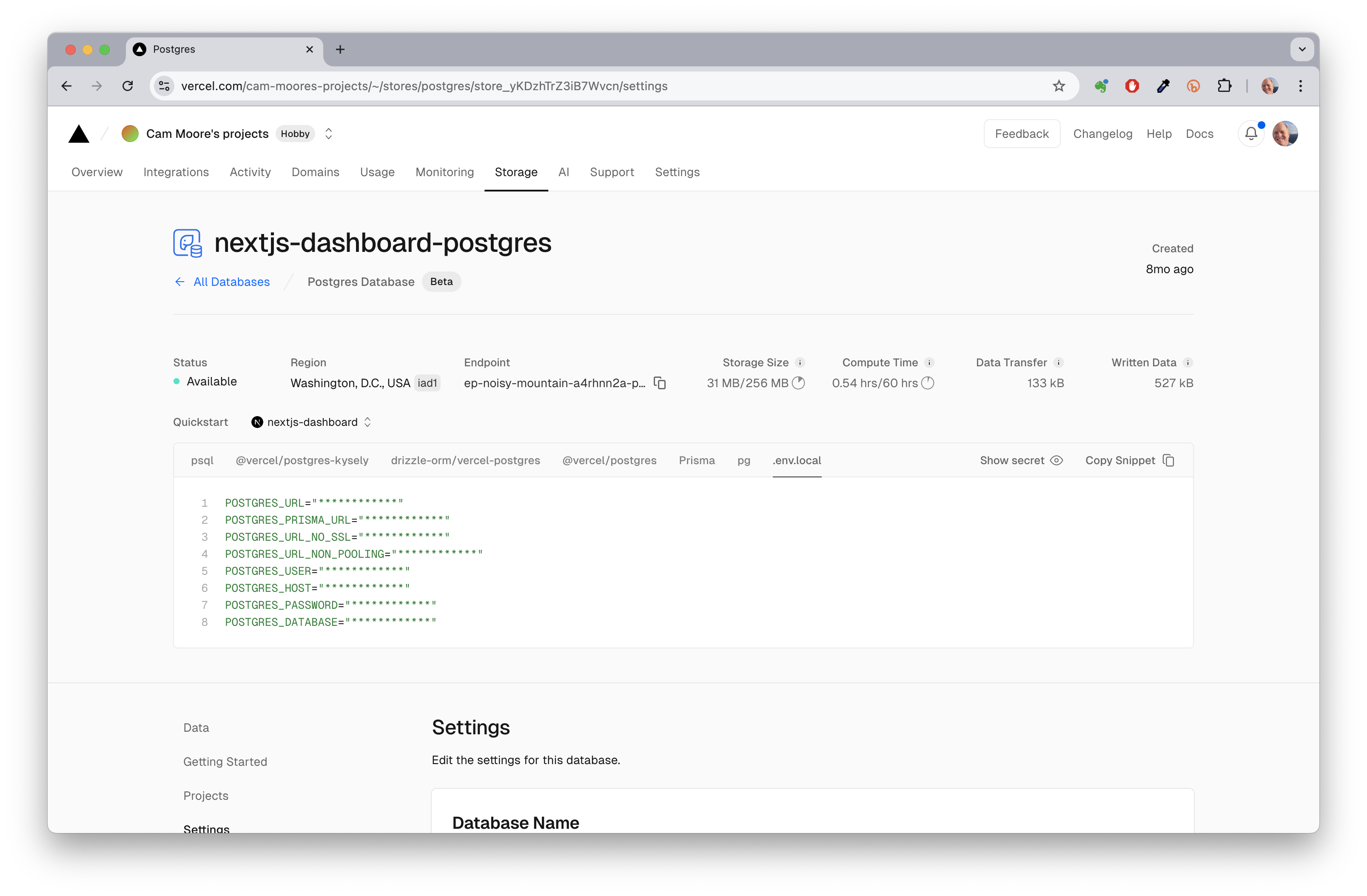 When you connected your my-nextjs-application project to the Vercel PostgreSQL database, Vercel created environment variables needed to connect to the database. You can see these environment variables in the Vercel dashboard.