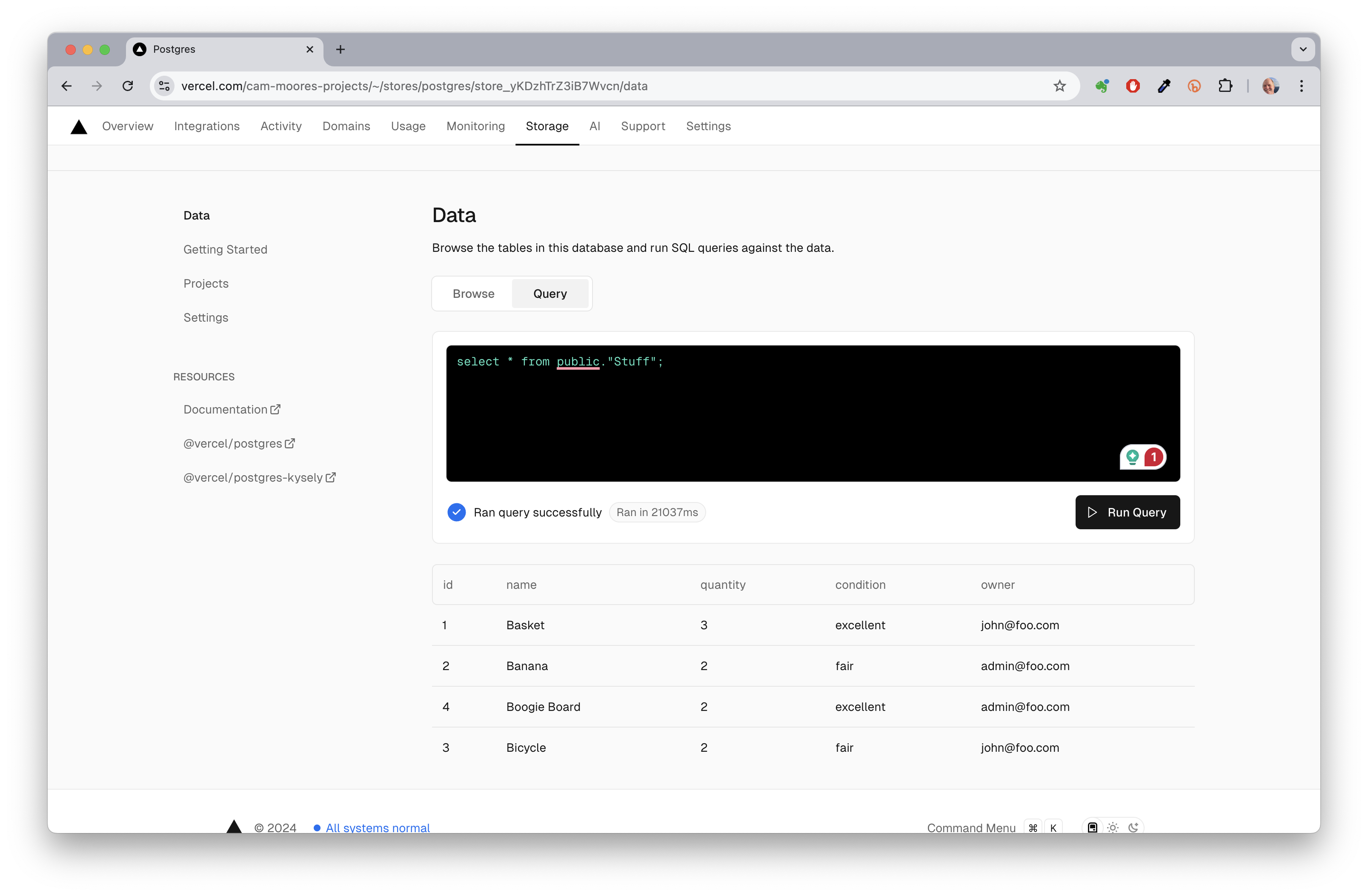 You can check the database in the Vercel dashboard to see that the tables have been created and seeded.