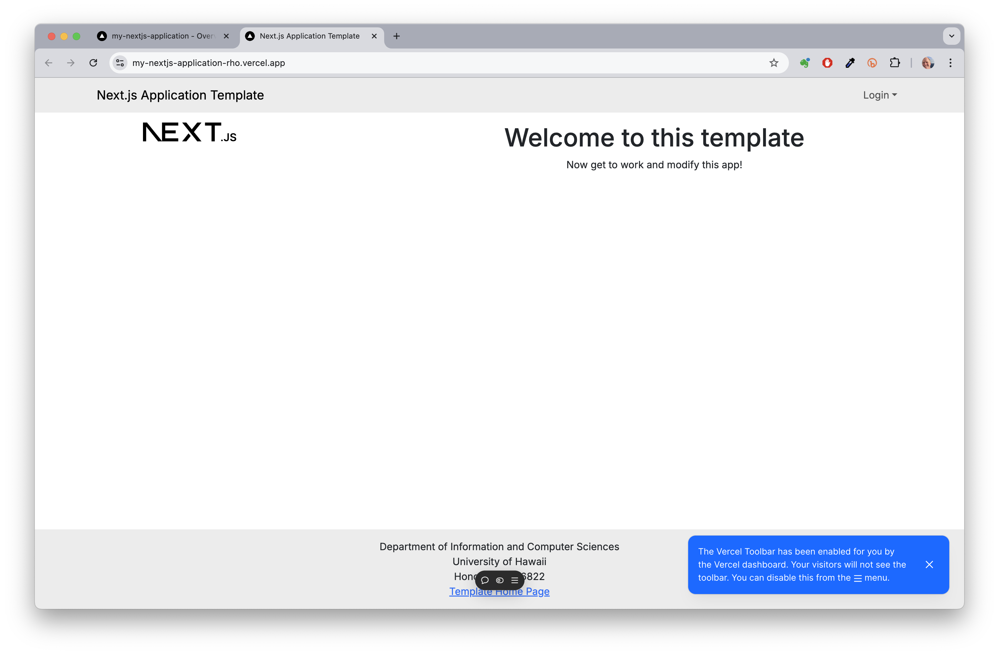 Use the Nextjs Application Template as a template to create a new project, named my-nextjs-application, in GitHub. Click on the green “Use this template” button to create a copy of this repo in your personal GitHub account. You can make the repo public or private, as you prefer. Then clone it to your laptop.