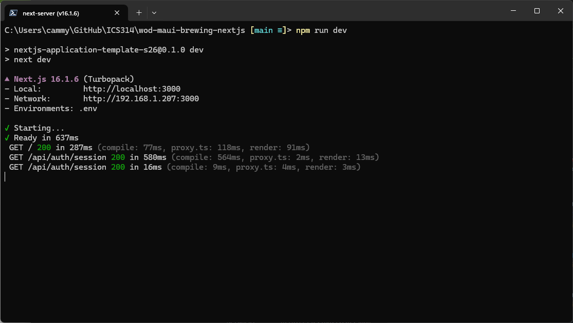 In the last screenshot, notice that the Chrome tab for the page says “Next.js-application-template”. To fix that, go to src/app/layout.tsx, and change the MetaData title to “Island Snow”. Here’s what it should look like: