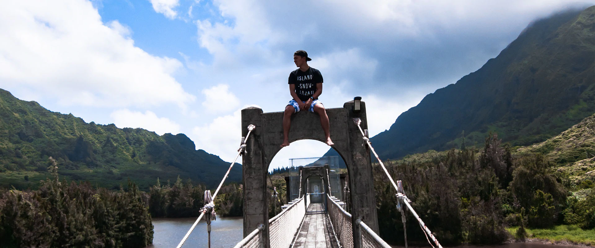 Use another “row justify-content-center” class to format the full-width photo of the model sitting on the bridge. Get this photo here.