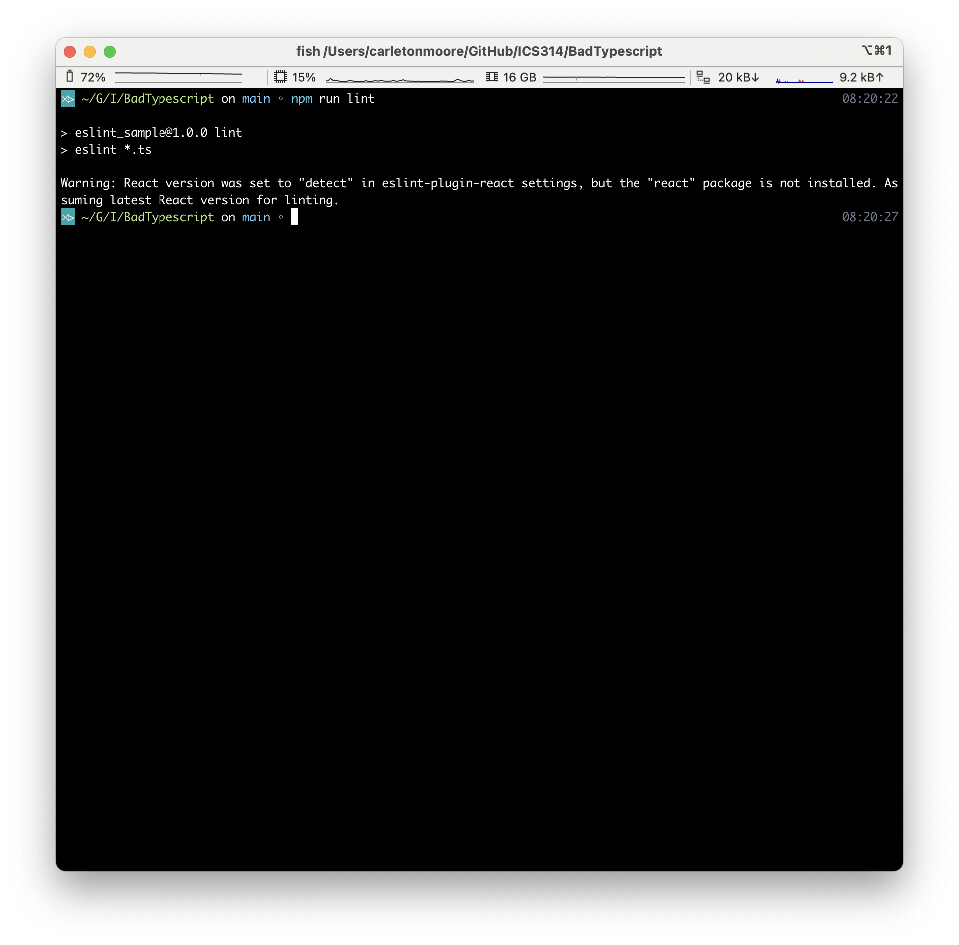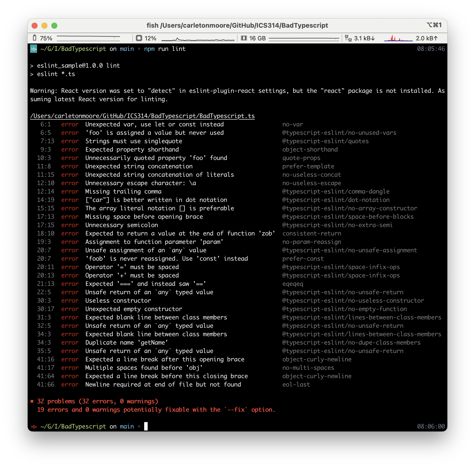 While you do not have to submit anything more than the above for this experience, your ability to install ESLint and use it to remove warnings will be evaluated in subsequent experiences. So be sure to complete this experience successfully! If you run into problems, see the TA or the Instructor or a classmate to help you fix it.