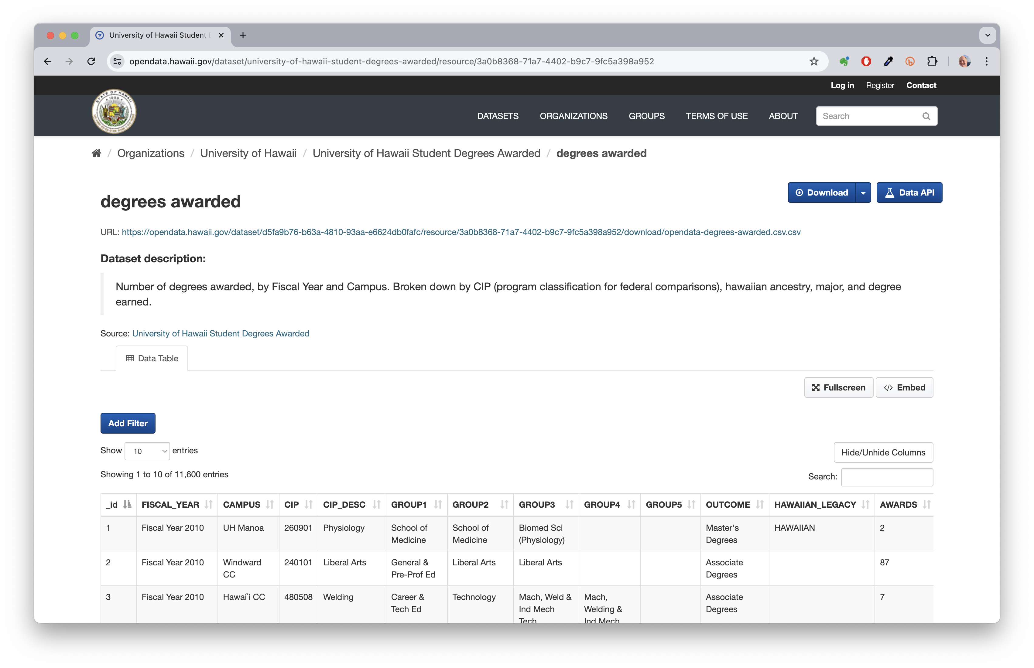 As before, we’ll use a Hawaii Open Dataset providing University of Hawaii Student Degrees Awarded. Here’s a screen image of this dataset: